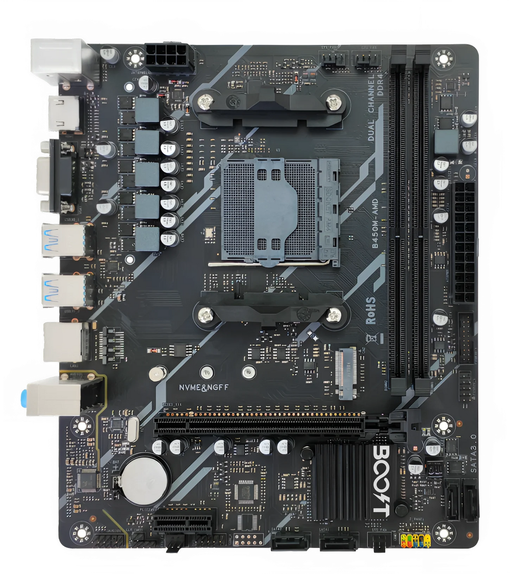 • Processor and Chipset: Supports AMD Ryzen CPUs with an AMD B450 chipset.