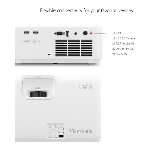 - LAN CONTROL: Schedule, and manage the projector remotely with Crestron, AMX, Extron, PJ Link, ATEN, and ViewSonic’s vController