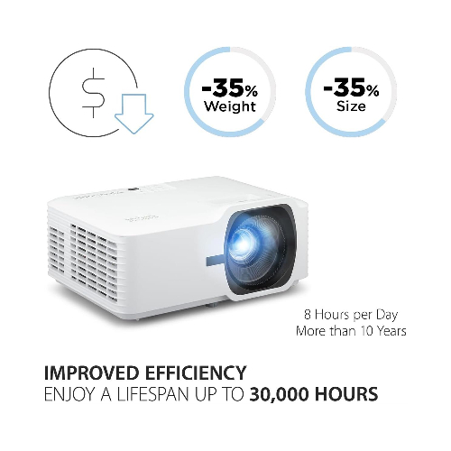 The LS740HD belongs to ViewSonic’s Luminous Superior series, a lamp-free high-brightness projector line up designed for commercial and educational spaces. With its adoption of the 3rd generation laser phosphor technology, it delivers 5,000 ANSI Lumens for up to 30,000 hours, ensuring bright and vivid images without lamp replacement. The lamp-free design offers an eco-friendly and cost-effective solution, while the projector‘s light weight and compact design reduces transportation costs.